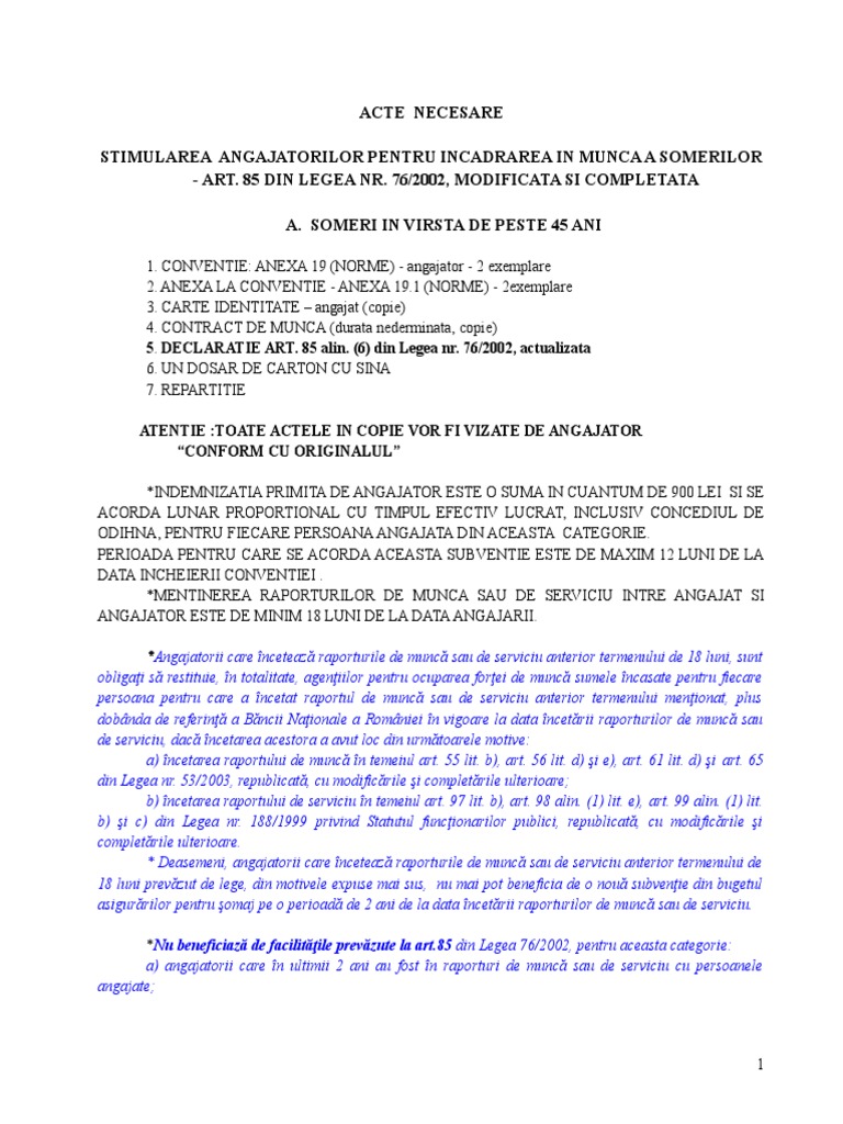 A) 5 zile lucrătoare pentru o durată a contractului individual de muncă mai mică de. 73^1 alin.(2) din legea 76/2002 privind sistemul asigurarilor pentru somaj si angajare si concedieretanarsomerfacilitatilegea 76/2002. Outside diameter of ring, od. 76/2002 privind sistemul asigurarilor pentru somaj si stimularea ocuparii fortei de munca, cu modificarile si completarile. Daca ai repartitie pentru persoana respectiva poti intocmii documentatia pe noile imprimate valabile de la 01.01.2018,conventia in 3 exemplare,tabel nominal in 3 exemplare,o declaratie,etc.si contract munca,xerox c.i.al.