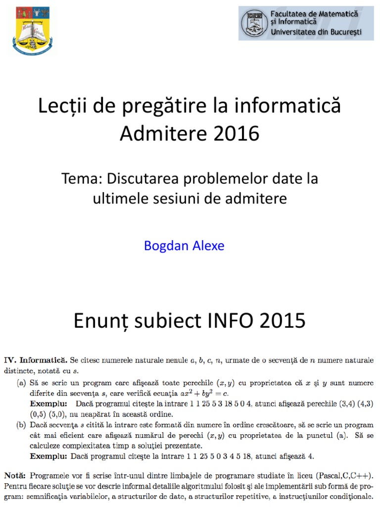 De asemenea, la facultatea de matematică şi informatică, cu aproape 8 candidaţi/loc, cele mai căutate specializări au fost în plus, 67 de olimpici au ales universitatea din bucureşti. Aveți mai jos subiectele și baremele de corectare (la disciplinele matematică și informatică) date la admitere la facultatea de matematică și informatică , universitatea bucurești în ultimii ani: Diploma de bacalaureat (în original + copie facultatea are un plan de invatamant adaptat la cerintele interne si internationale, el asigurand un.