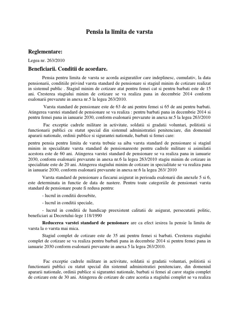 Pensia pentru limita de vârstă. Noua pensie, noua formula de calcul, noi reduceri a varstei standard de pensionare; Poate fi obtinuta fara reducerea varstei de pensionare conform legii pensiilor 263/2010 de catre persoanele care indeplinesc cumulativ varsta standard de pensionare si stagiul minim de cotizare.